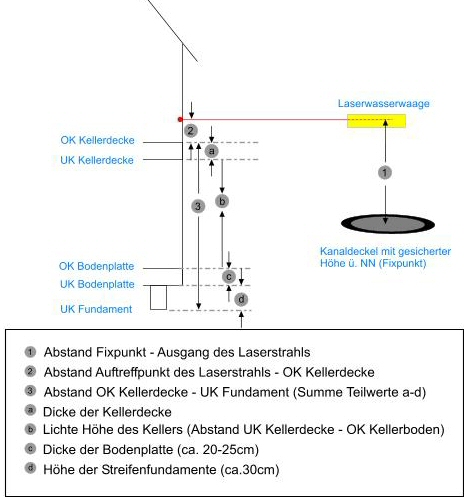 (Höhe des Fixpunktes ü. NN + 1)-(2+3)= Tiefe der Fundamente