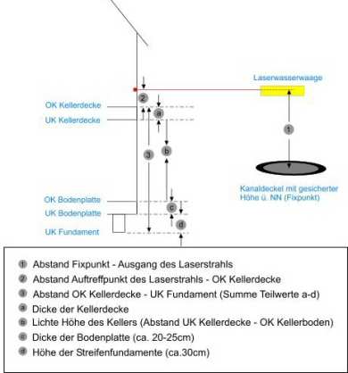 Die Abbildung gibt den Vorgang der Vermessung mit einer Laserwasserwaage wieder. Positionieren Sie die Wasserwaage zunächst über dem Fixpunkt und richten Sie diese waagerecht aus. Richten Sie dann den Laserstrahl auf Ihr Haus. Messen und notieren Sie sich dann die in der Zeichnung gekennzeichneten Maße in Meter. Die Tiefe der Fundamente errechnet sich dann wie folgt: